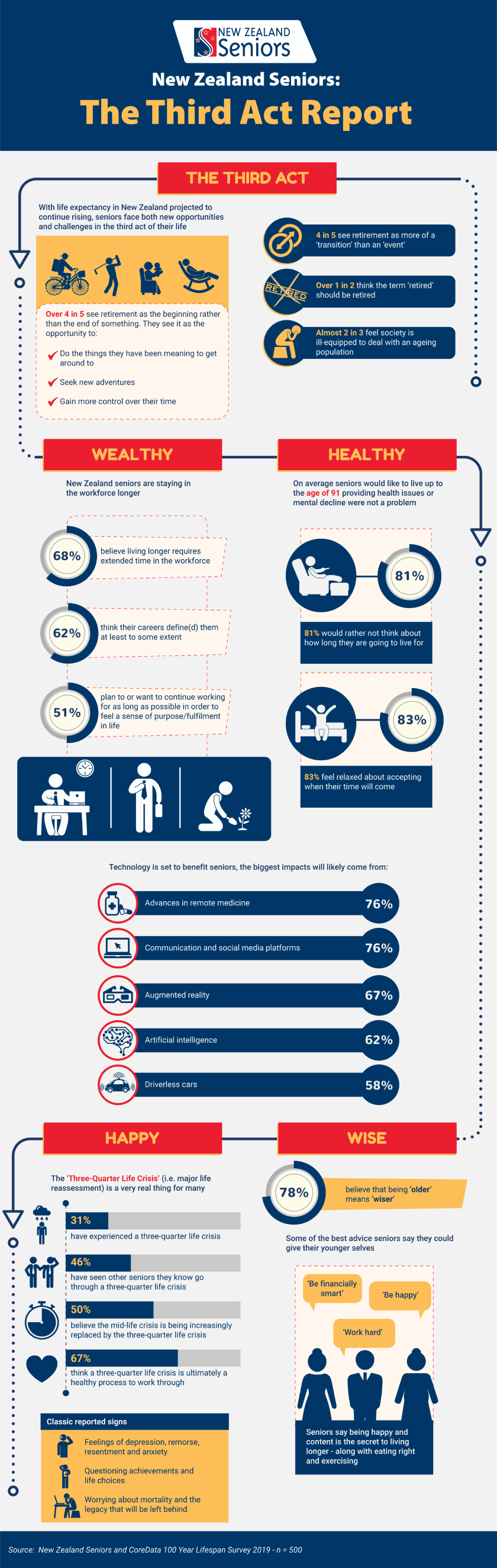 The average life expectancy in New Zealand currently stands at 81.6 years, and as this figure continues to rise, it can lead us to question what we really want out of life and what the societal impacts are for us, and others. This is explored in detail in our latest instalment of research – The Third Act report.