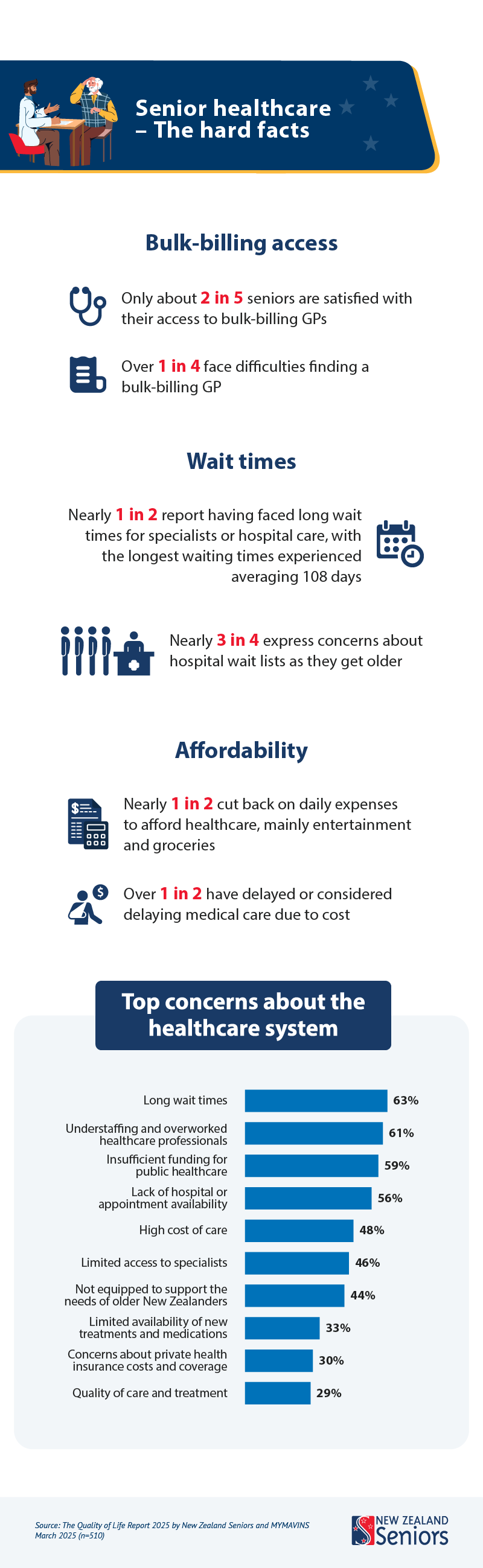Karen Billings-Jensen, Chief Executive of Age Concern New Zealand, says: “Concerns around timely access to healthcare, including long wait times to see doctors or specialist support, hospital waiting lists, and staffing levels, illustrate just some of the difficulties seniors face during retirement. It’s concerning that some older people are managing rising healthcare costs by cutting back on social activities, or more worryingly, cutting back on food and grocery expenditure, as we know that risks around malnutrition and isolation impact ageing outcomes.”